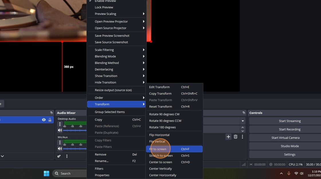 You may encounter an issue where your newly added video source does not fill the entire canvas. In the example above, there is a significant amount of black space between the camera video and the full 1920x1080 canvas that viewers will see. We can fix this by right-clicking the video preview on the canvas. This will bring up a list of options. Look for “Transform,” move your mouse over it, and click “Fit to Screen.” This will resize your video source to fill the canvas, assuming your video source is also in a 16:9 format.