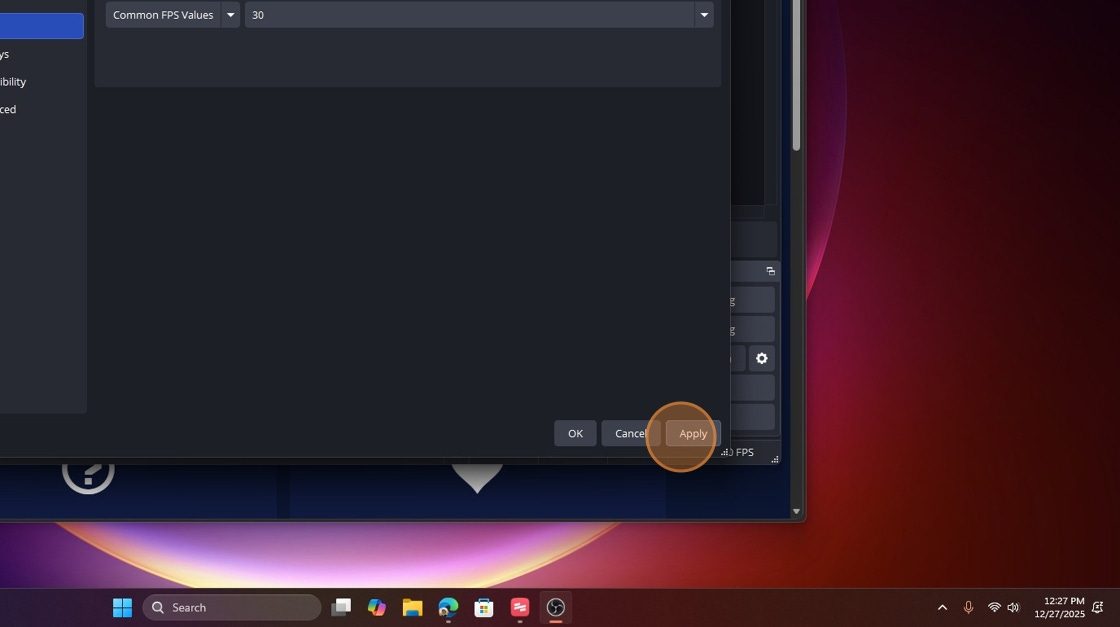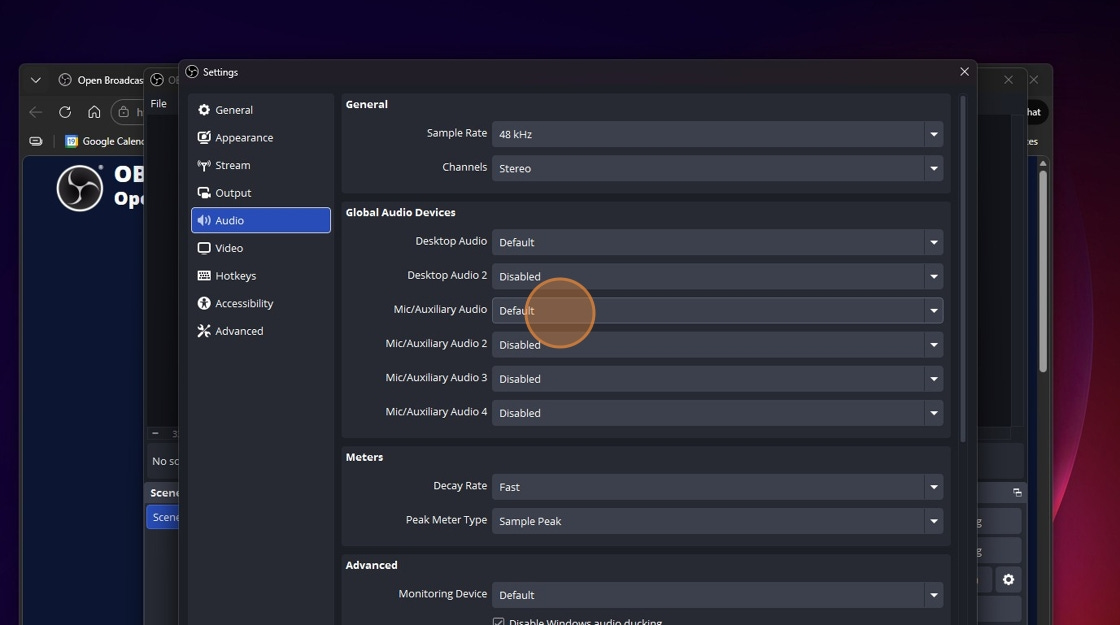 Select your audio interface (make sure it is powered on and recognized by the computer) and choose it as the device listed under “Mic/Auxiliary Audio.” After doing so, click the “Apply” button again, just as you did in the previous video step.
