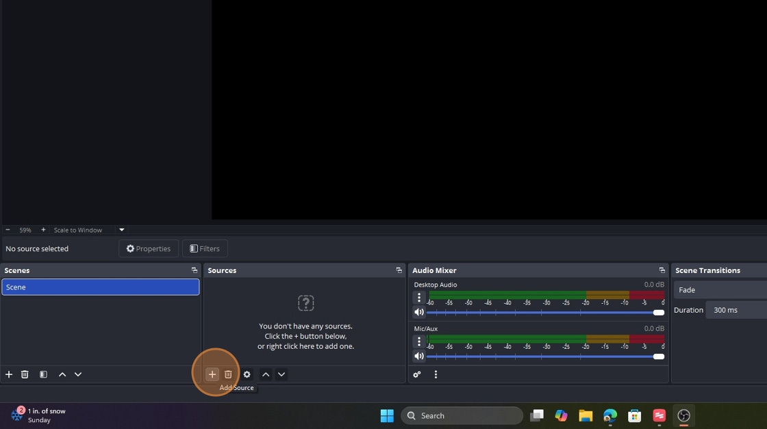 Once you name your initial scene, we can move on to adding your first source, your video source. Next to the “Scenes” panel, you will see the “Sources” panel. Click the “+” button next to the trash can icon in that panel.