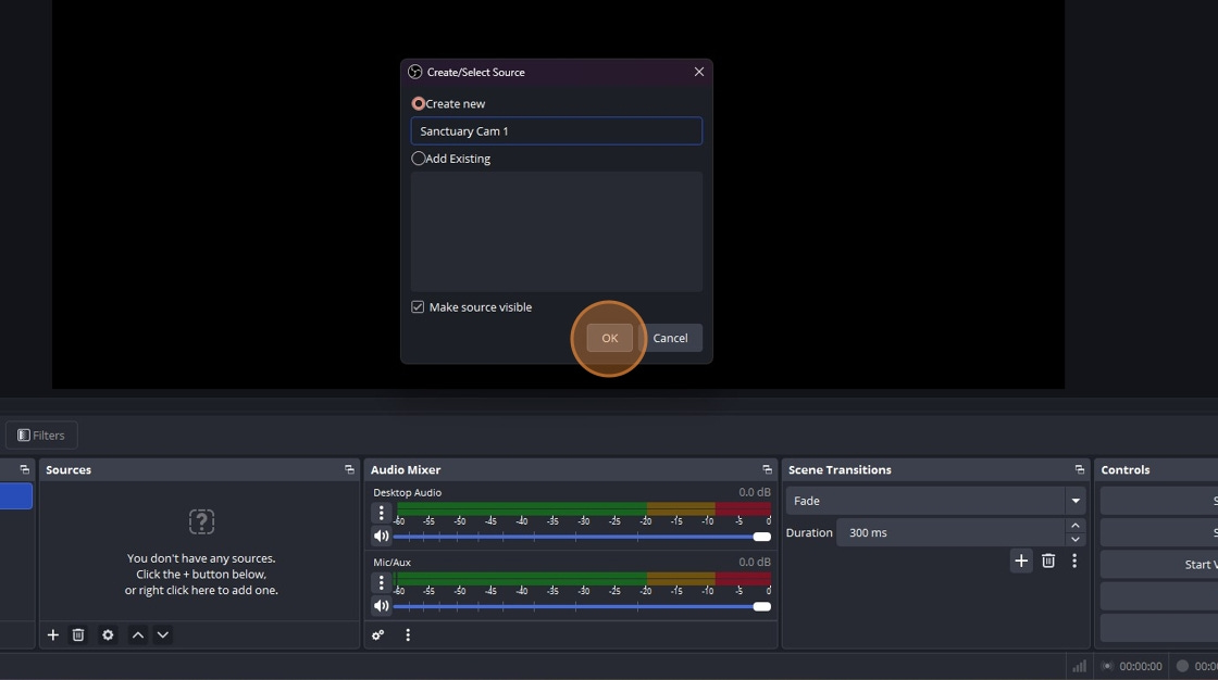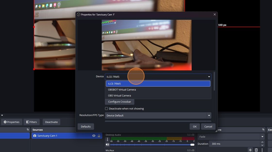 Like your scenes, you will want to be diligent about naming your sources. In the example above, I call it “Sanctuary Cam 1,” but you can name it something else if you have a specific location or purpose for your camera. Once you name it, click “OK.”