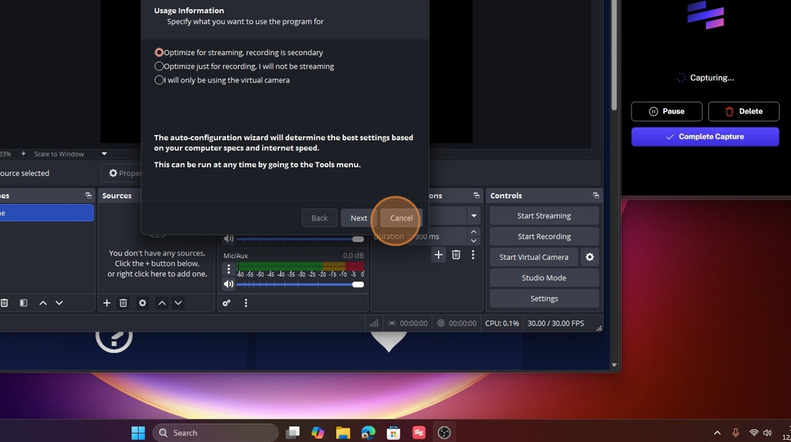 OBS should launch if you left the option checked in the previous step. When running OBS for the first time, you will be greeted by a window prompting you to run an auto-optimizer. For now, we will skip this step so I can walk you through the setup manually.