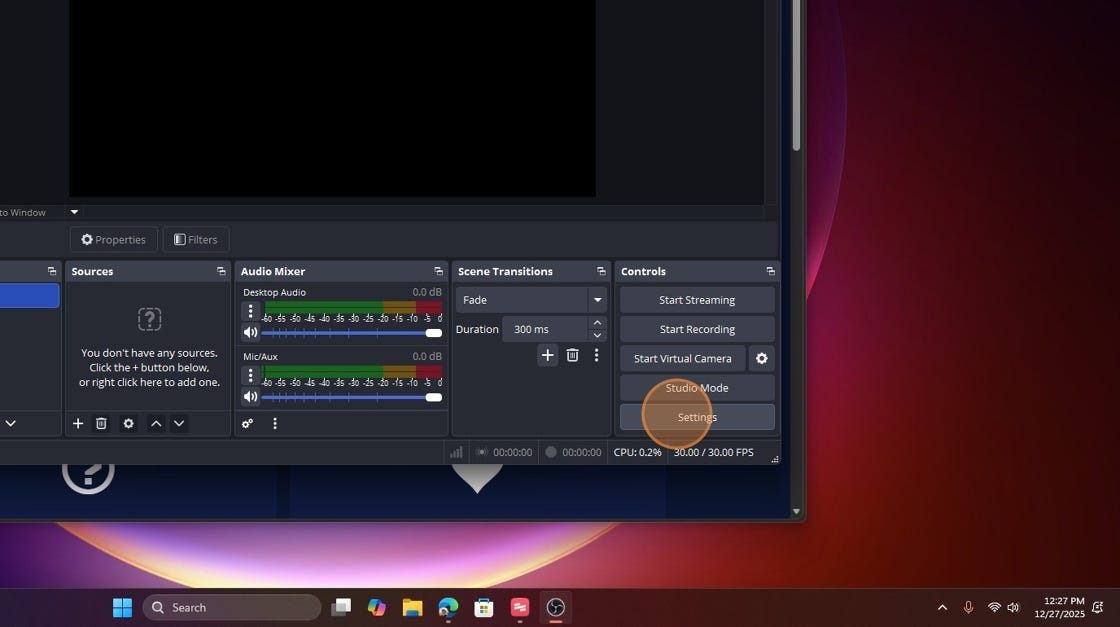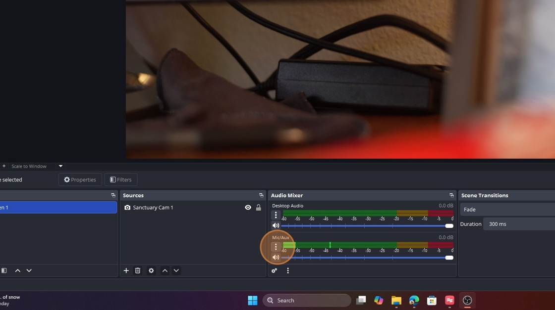 To fix this, locate “Mic/Aux” under the “Audio Mixer” panel. Click the three vertical dots, as shown in the image above.