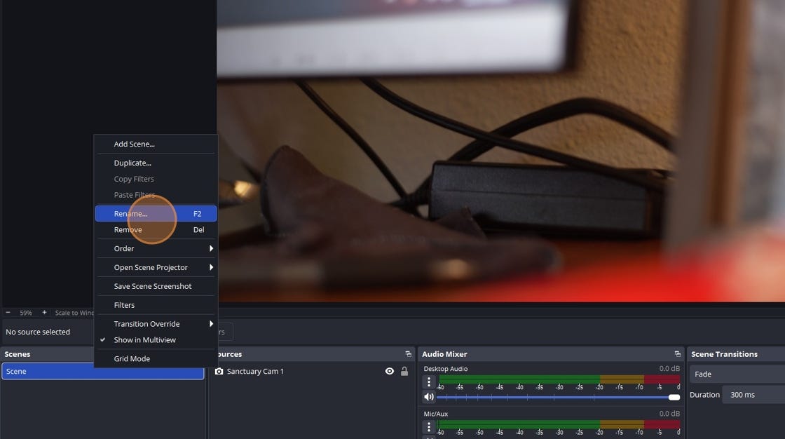 To retitle a scene or other elements such as sources, right-click the item you want to rename. You will then be able to enter a new name for that item. For example, you might want to name the first scene something simple like “Sanctuary,” or choose a name that clearly reflects what the scene will show. In a single-camera setup, some examples might include Video, Slides, or Video + Slides.