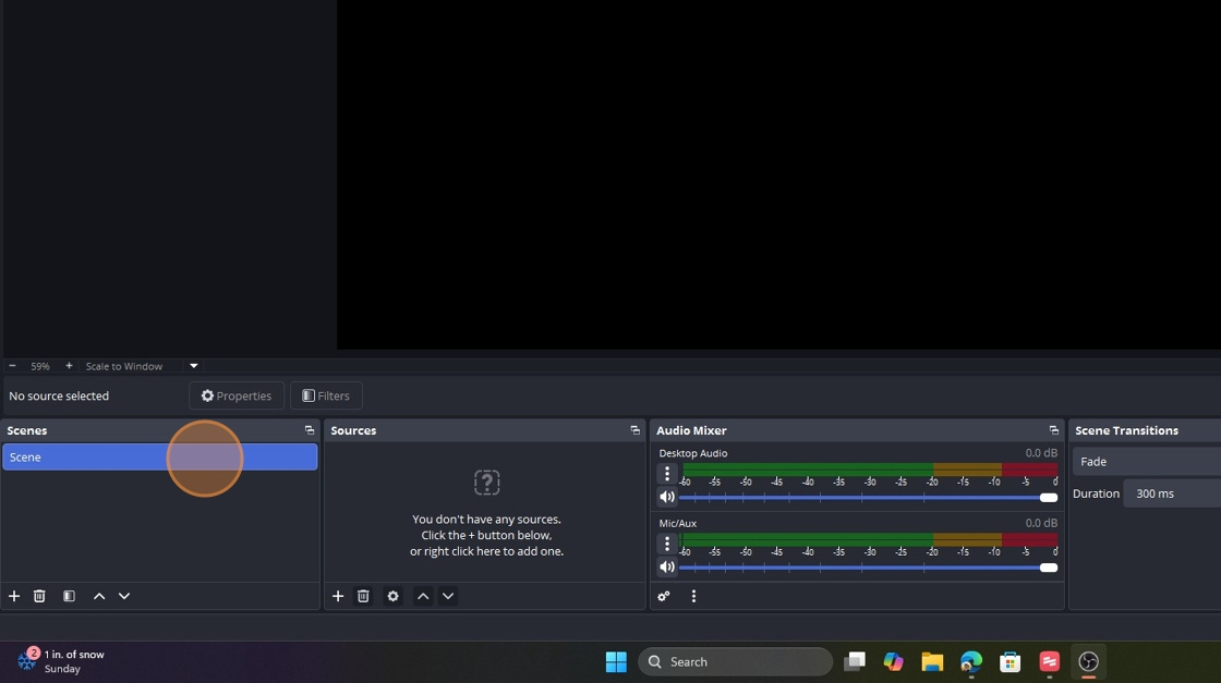 By default, OBS starts with one “Scene” in the “Scenes” panel. OBS requires that at least one scene be present.